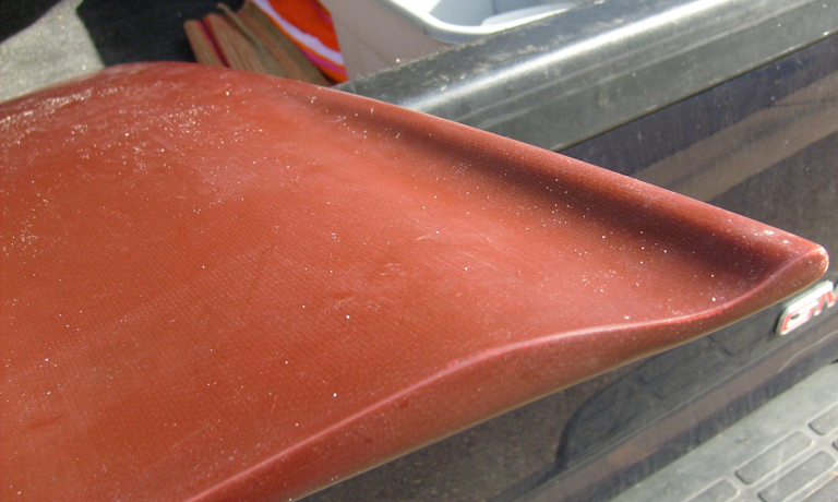 I don't use it too much these days but it has been well used. It's fast and rode well - you're drawing longer lines than a finned board which allow more abrupt direction changes. The design is the result of tracing around the outline of one of John Galera's NoFins.