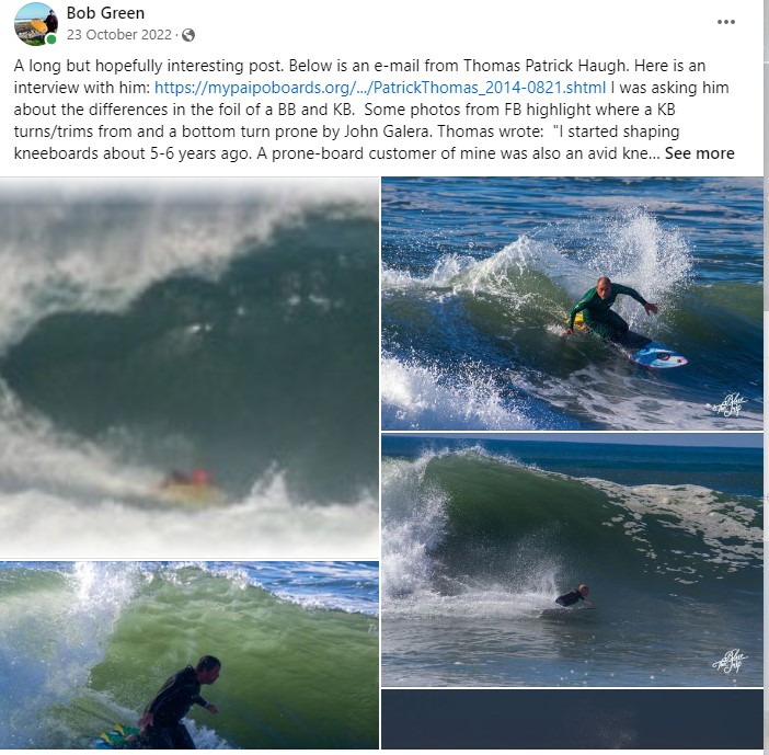A long but hopefully interesting post. Below is an e-mail from Thomas Patrick Haugh. Here is an interview with him: https://mypaipoboards.org/.../PatrickTh ... 0821.shtml I was asking him about the differences in the foil of a BB and KB. Some photos from FB highlight where a KB turns/trims from and a bottom turn prone by John Galera. Thomas wrote: "I started shaping kneeboards about 5-6 years ago. A prone-board customer of mine was also an avid kneeboarder. He was constantly asking me to shape him a KB, which I declined to do, having no personal experience riding KB (as you probably know, I’m very reluctant to shape anything I don’t personally ride. It goes against my build-test-build-test shaping philosophy). I finally gave in when he proposed that I build him a KB based upon my G4 prone-board.
