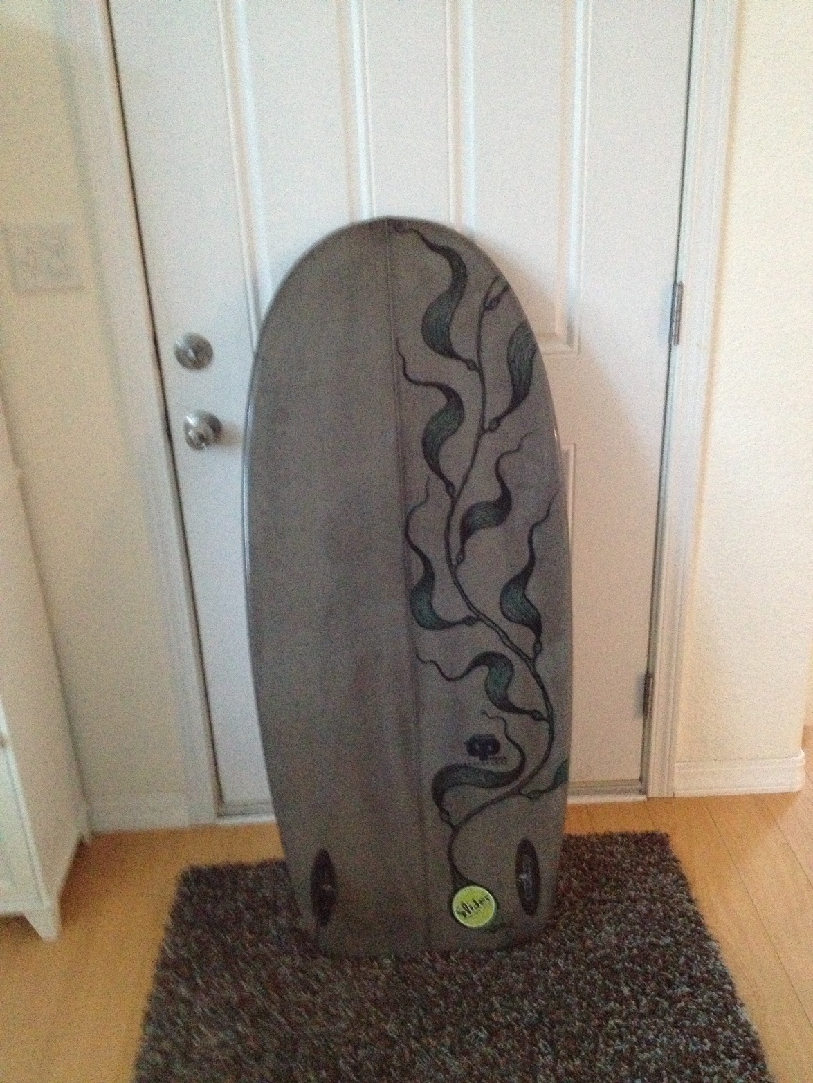 This is the orginal T-Belly I built about 3yrs ago. The owner has moved to Florida and asked me to sell it for him. The board is in excellent condition, with no dings, dents. cracks, etc. The owner had San Diego artist Bryan Helfan (http://www.bryanhelfand.com/) add the kelpy artwork on the bottom. Color is grey resin-tint bottom and rails with cleardeck and black pin line. Board comes with LokBox fins and leash. See drawing below for dimensions. Price $250 OBO Free shipping! I'm 5-10/190 and board works great for me.