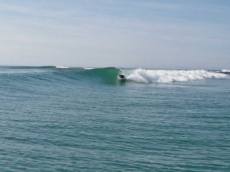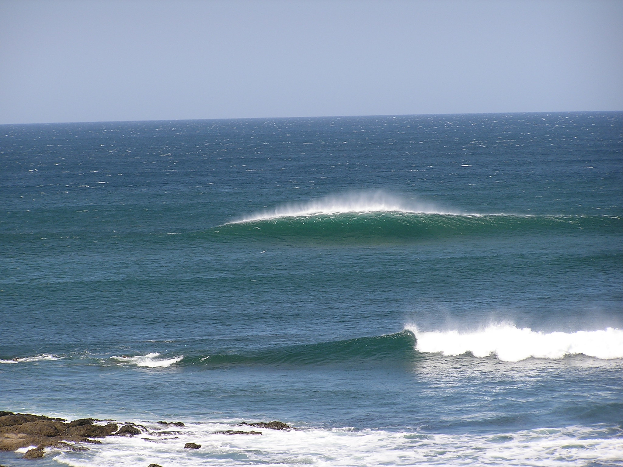 This is a place that I surf when it breaks while we are there. The wave is probably a half mile paddle out, at least a quarter mile straight out. The wave pictured is between 10 to 12 foot. You might notice the slight cross shop, or wind swell at an angle perpendicular to the forward motion of the breaking wave. It can be relatively glassy but a slight cross swell from light northerly winds run across the face. When making speed on the drop and when charging across the face I sometimes find myself "skipping" violently, or going airborne for 5 to 10 feet, landing and taking off again with continuing great speed and force. A couple of years ago a couple of ribs were bruised and tender.