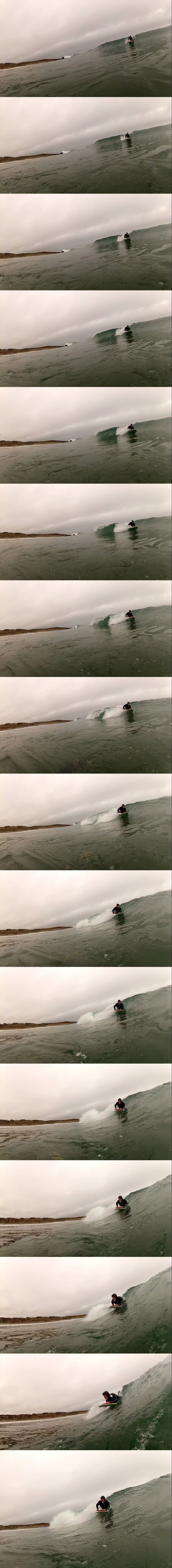 If you look real close at the first 2 frames you will see that almost a half of the body is off the board, tail is drifting laterally,but being controlled by the pressure from the handle and the outside rail…it's a fun experience and can be more extreme depending on the situation, ends up like riding a large hand plane sometimes, and can really set you up nicely for barrels and whatnot.