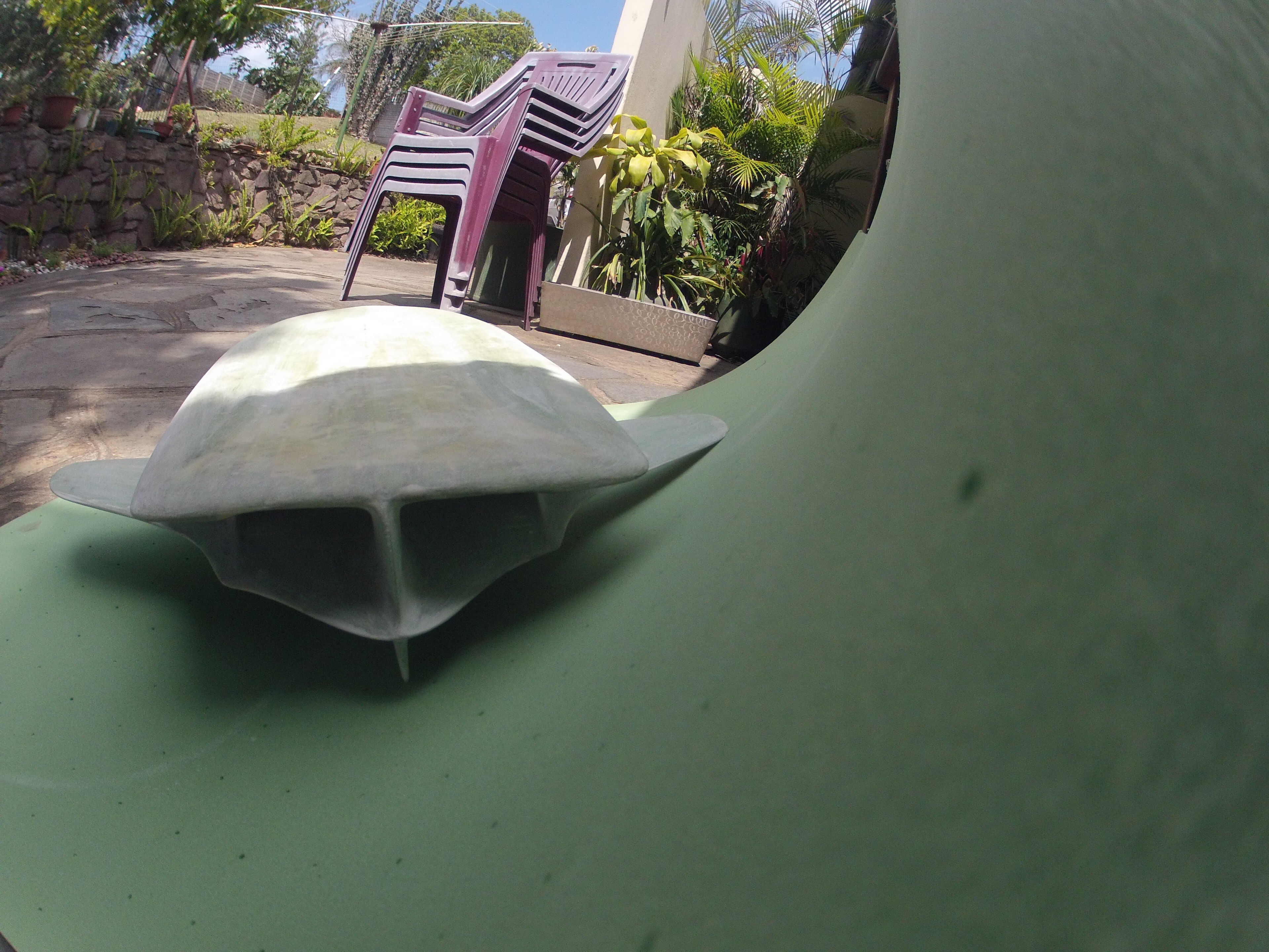 I finely gave the red board a test ride. It’s the longest I have left a new concept un-ridden . The small size and low volume must have put me off ? The waves were 1m , 9sec , with strong off shore winds .The first surprise was how drag free it felt, with its bits hanging off the bottom in the water flow. The next surprise was its ability to duck dive, with very little forward speed I could glide under water with small wrist movements move up or down, with an amazingly flat glide path. This should be great for getting out in big conditions , using kick board method with elbows just in front of the tail hands griping just behind the nose could catch waves easily , as anticipated it rolled off the wing centre engaging the wingtip as speed picked up driving down the face. But that’s when the problems start because of small its size it’s hard to hold onto and control , on my elbows control was good but as I move forward it was difficult to lock onto the board ,it was a short about 15 wave test ,it seems the small size is good and a bad , it needs lots more testing. Obviously a bigger decked board is on the slab