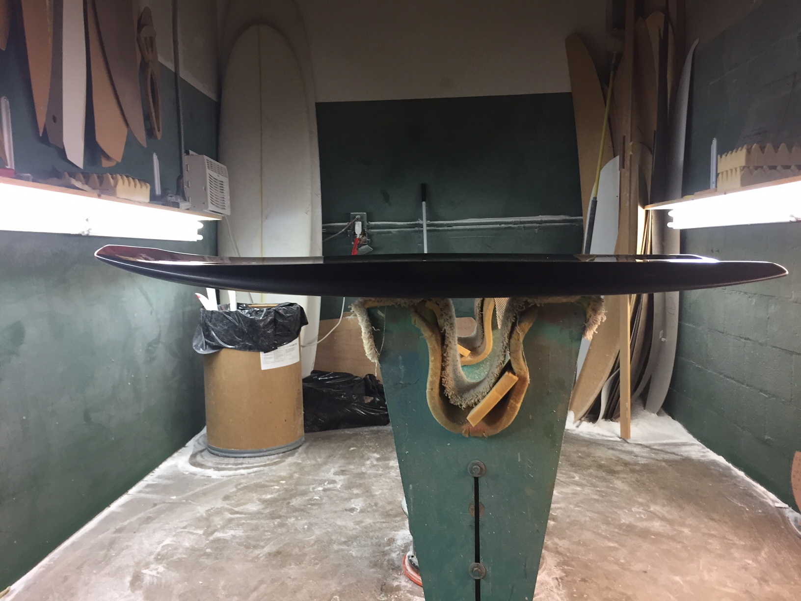 The bottom is otherwise standard G4; convex nose, slight concave in mid-section and dual exhaust tail concaves. I’m starting to thin out the tail of my prone boards a little more. I believe this helps the tail sink on take-off, keeping the board (and rider) more parallel. The board will have quad fin-boxes (of, course) and I designed a small, relatively flat section in the bottom where the fins will be located as a courtesy to my glasser. The board will be finished in 5.7oz carbon fiber, one layer deck and bottom. At this point in the process shaper becomes surfer, and I begin to pester my glasser with “Is my board ready yet?”