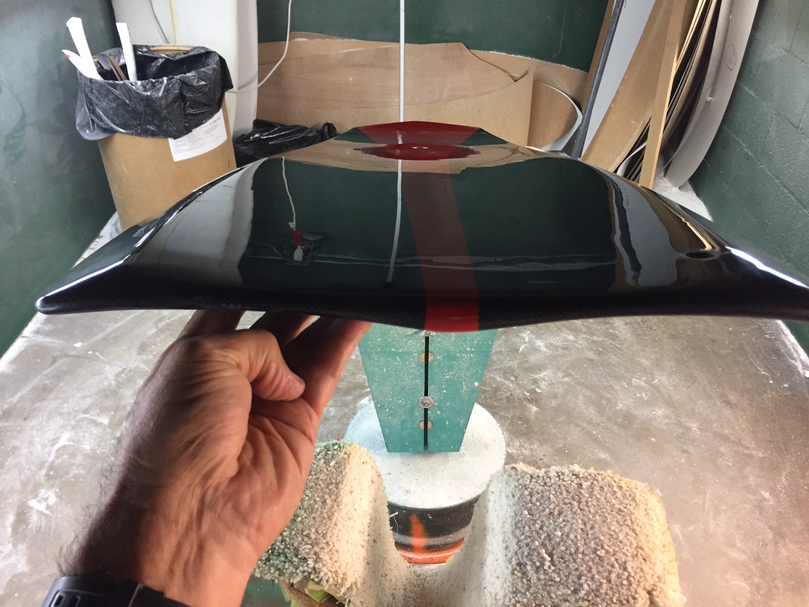 The bottom is otherwise standard G4; convex nose, slight concave in mid-section and dual exhaust tail concaves. I’m starting to thin out the tail of my prone boards a little more. I believe this helps the tail sink on take-off, keeping the board (and rider) more parallel. The board will have quad fin-boxes (of, course) and I designed a small, relatively flat section in the bottom where the fins will be located as a courtesy to my glasser. The board will be finished in 5.7oz carbon fiber, one layer deck and bottom. At this point in the process shaper becomes surfer, and I begin to pester my glasser with “Is my board ready yet?”