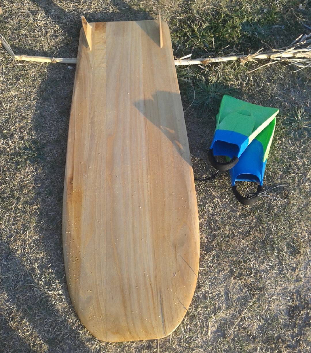 The board below is one my first paipos (Paipo Granota 4'), the photo was taken after a session (fin on the left got bent) to show a friend that the fins needed stronger base to avoid losing them. Later, I started riding fin-less and playing with channels/concaves, but still relying on side-bites and small fins to hold on steeper sections.