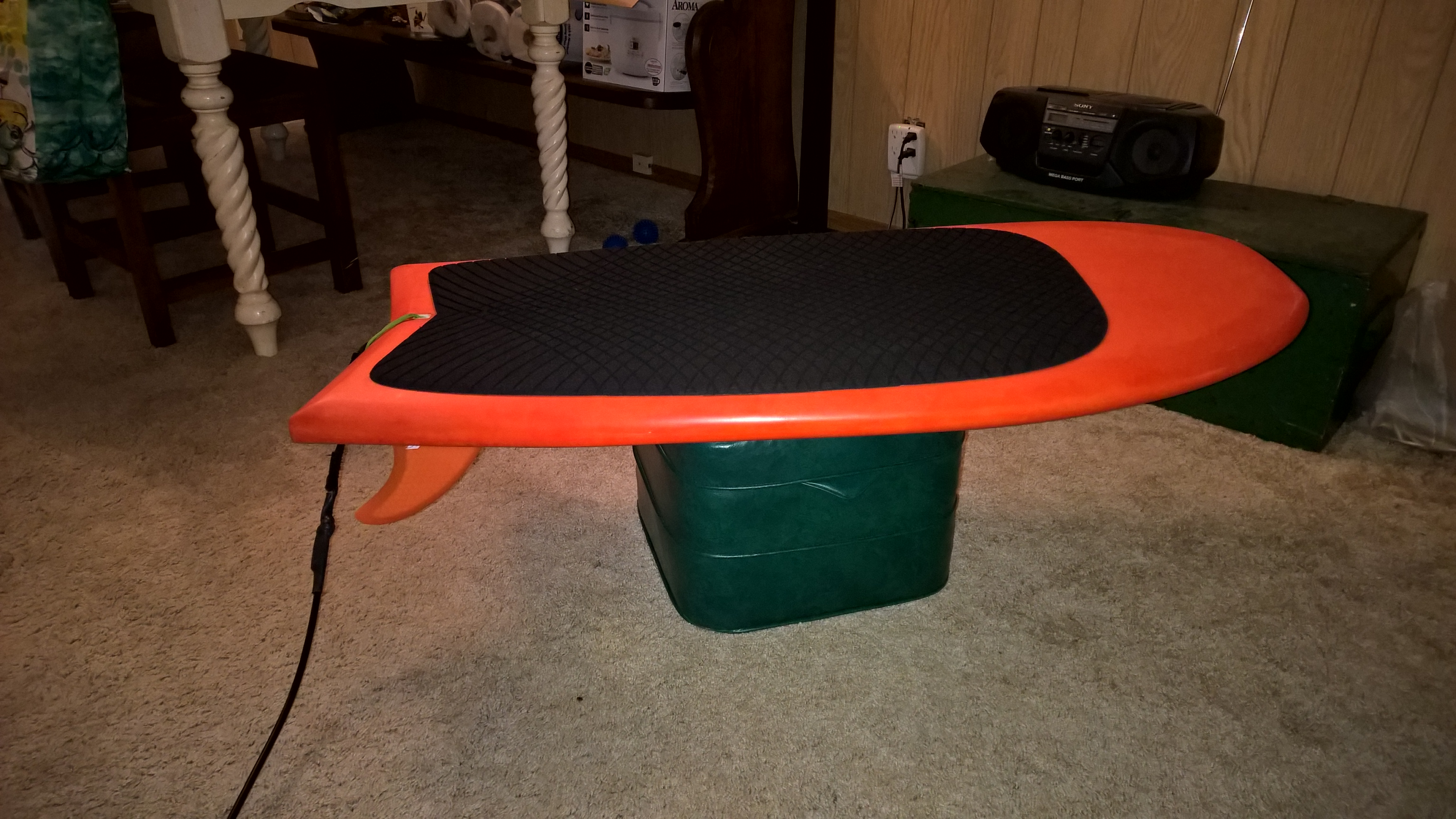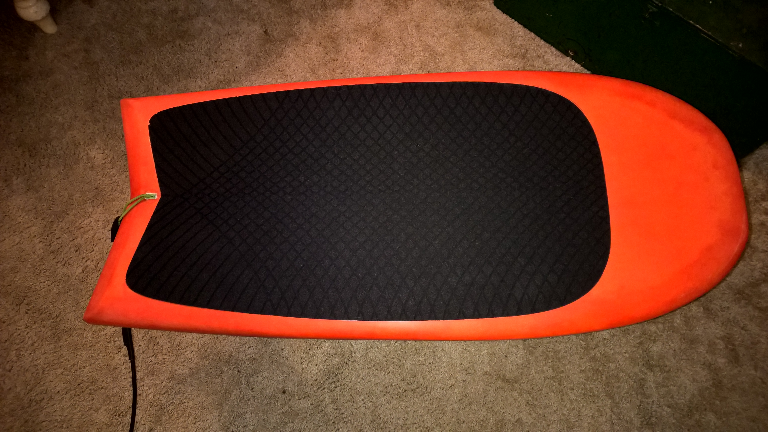 Here is my finished with the pad on.[img][/img][img][/img]. I have been riding it for awhile now. I haven't had any really great surf, but some different waves big and small. It rides great with the pad on. But it definitely added some float, but not too much. I think it has about the same volume as my 51 1/2" board. What I amazed but is how it paddles and kicks. It paddles better than my bigger boards even ones with more volume. I think it is because being shorter you are further forward on the board, when paddling. Also the fish tail helps you lay further up on the board. I kept the rails a little to help with paddling and the bottom is pretty flat out to the edge. I originally built this board for summer beach break where you have to duck dive a lot. But I see that it ended up having more volume than expected. I am going to make a more precise caliper gauge. But it still duck dives pretty well. I am going to make a thinner version sometime. Right now it it is great for all conditions. I used to think that I could take my last board anywhere. Now I feel the same with this one.