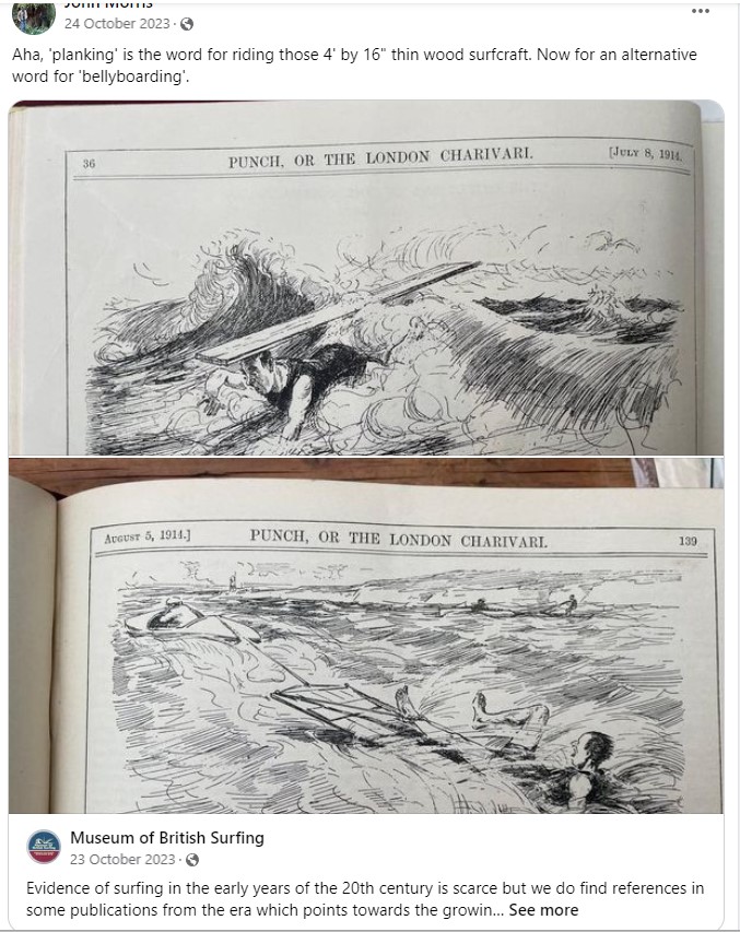 John Morris There aren't too many photos of boards or surfing, 1900 to the 1950s. This photo from 1906, was taken from Edison's film, excerpt here: https://www.youtube.com/watch?v=dz32fG3Y2dY Wally Froiseth told John Clark, that before his Pai Po boards, boards were shorter, narrower and thinner.