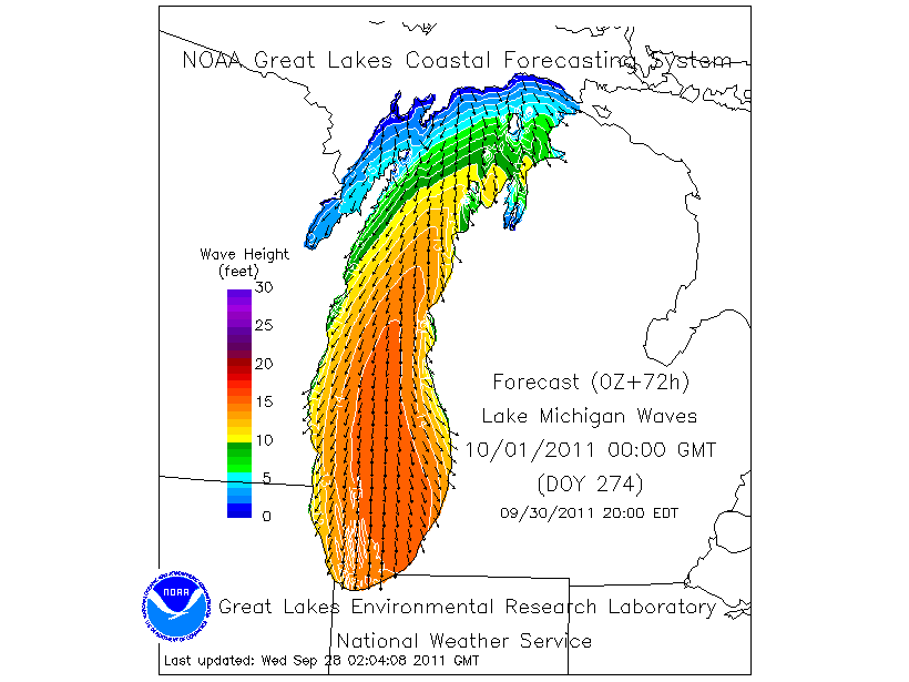 So here's the scoop. This was a massive NW wind swell that blew up all down Lake Michigan, peaking around late morning on Friday Sep. 30th, then gradually diminishing thru Saturday afternoon. I got to the water about 2 pm on Friday and this is what it looked like.