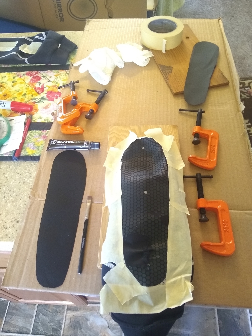 A problem with my otherwise good swim fin socks has been the soles wearing out so easily when walking across fields, parking lots, and the like. The soles begin wearing through, developing holes, allowing shell fragments and grainy stones come between my bare foot and swim fins. So, I decided to explore patching materials with peel off adhesive material in addition to awning material + aqua seal where I cut out a heel and sole pattern. All these materials have been very flexible, light and thin. At home, I used some clamps, wood slats and pressed the material and fin sock for at least several hours for a solid adhesion, but I'd feel confident in jury-rigging a patch under a table leg with a book, catalogue or such--whatever when you are out and about and not in the 1st World. An alternative to awning material could be used bicycle inner tubes.