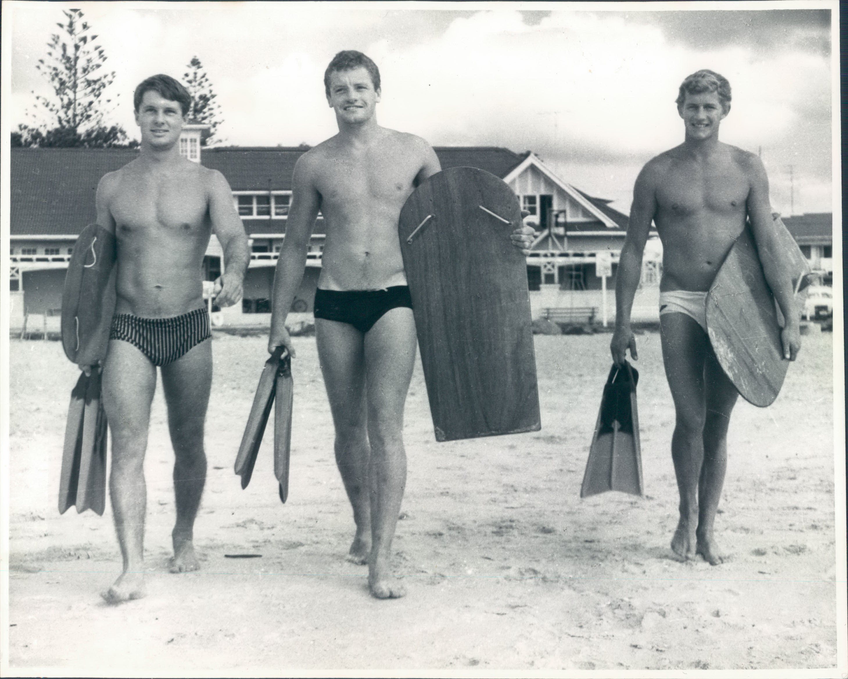 Kit, Jeff Callaghan and Robert McDermott at Kirra in 1965.