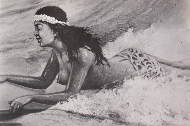 Sources: See the Paipo Annotated Bibliography. The image on the right appears in: Margan, F., & Ben R. Finney. 1970. A pictorial history of surfing. Sydney: Hamlyn. [page 25]. The book's caption reads, "An early painting of an Hawaiian girl riding a surlboard in the pre-missionary days." |