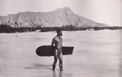 ![]() This famous image is often mistaken for being a surfrider holding a paipo board. It is really an alaia board which was most likely ridden in the standing position. Alaia boards were also ridden in the sitting, kneeling and prone positions. For a similar image of a surfrider holding a paipo, see this very different board. |