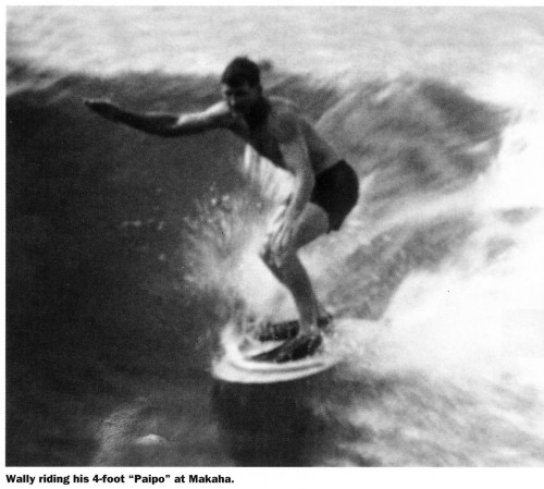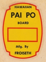 In everyday conversation, pae po`o was often shortened to pae po, which is common among Hawaiian words that end with double "o's," such as Napo`opo`o on the island of Hawai`i, which is often pronounced Napopo. The popular spelling used today, paipo, was coined by Hawaiian surfing legend Wally Froiseth, who, besides being an excellent surfer, was an exceptional paipo board rider who was famous for standing on his twin-fin board while riding big waves. From 1956 to 1986, Froiseth made approximately 150 paipo boards, which he sold to friends and other surfers, putting a decal on each board to identify it as his product. No one before him, however, had ever spelled pae po, so without the benefit of seeing the word in print, Froiseth spelled it as he heard it, pai po. His decals read, "Hawaiian Pai Po Board. Mfg. by Froiseth." Froiseth sold some of his boards to surfers from California, which helped to introduce the word and its spelling outside of Hawai`i, and today paipo is the accepted term for wooden bodyboards. |