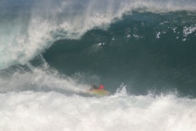 Paipo rider named Sean Ross having fun at the Pipeline. He is riding one of Paul Lindbergh's Hawaii Paipo Designs boards. Sean was a life guard at the Ehukai Beach (Pipeline) for years in the 1970's. Photo: Alan McCray, Hawaii. |