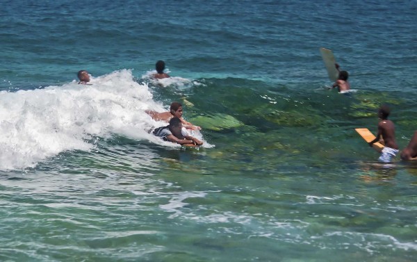 Unidentified paipo surfer at Maria's Point, Rincón, Puerto Rico, March 18, 2016. Looks like a foam/glass
