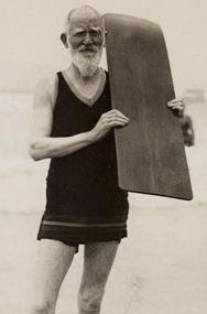 ![]() This famous image is often mistaken for being a surfrider holding a paipo board. It is really an alaia board which was most likely ridden in the standing position. Alaia boards were also ridden in the sitting, kneeling and prone positions. For a similar image of a surfrider holding a paipo, see this very different board. |