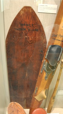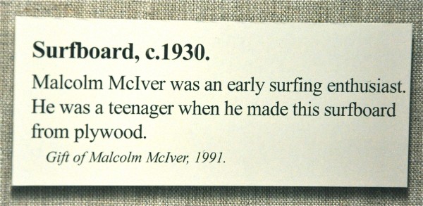 a Hawaiian plywood, fiberglass and resin paipo, a balsa twinfin bellyboard, some swim fins (including 1 of Mark Cunningham's), a McDonald's tray, a canvas mat (good for rashes from neck to knees), an early Boogie Board, a Hawaiian bellyboard (popular with visiting tourists in the '30s, '40s & '50s), and a Peruvian Caballito de Totora. We'll be adding a handplane soon as well. On display ca. October/November 2015. For more information, visit the Surfing Heritage & Culture Center. |