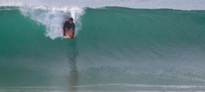 Unidentified paipo surfer at Maria's Point, Rincón, Puerto Rico, March 18, 2016. Looks like a foam/glass