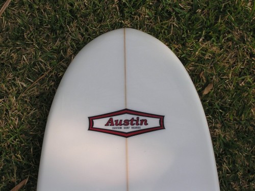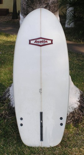 My wife really digs the looks of this board... so I am buying it for her as a Valentine's Day gift (ha ha, right!). Anyway, it is being added to my quiver. It is a carbon copy of my last one - the first paipo that Austin made - except for being a 1/4 inch thinner and a tad narrower - that should be good for some of the tropical waves that I ride. Update: Rode the board in Costa Rica during my March 2009 trip, along with the Orange Matter (the baseline Austin paipo), and the RPM passed with flying colors. The board is best in "performance waves" that have some energy throughout - the Orange Matter is better in waves with some flat, punchless spots. Having said that I would be pleased with either as a primary board and have now ridden both designs in a wide range of conditions (2 foot to 12 foot, punchy and hollow, fat and slow). I was pleasantly surprised with the RPM's wave catching capability given its reduced float. As expected, the reduced float means a slightly slower paddle out to the line-up, but on the other hand, easier duck diving - a reasonable tradeoff. The forward third are soft egg rails slightly turned under and the rear two-thirds are increasingly hard turned under rails. The board has a 3-fin box set-up. These sidebites have little angle (toe-in), if any, more like a traditional fish. To borrow another person's words, "Faster, more lined up and bigger waves requiring longer turns and high speed trims tend to desire more parallel side fin positions." My small sidebites (~2") are used in tandem with a single center fin (4.5" to 5.5" range normally; Update: 4.0" to 4.5") that can be adjusted forward or aft depending upon wave conditions. The pigment work by Austin Saunders and Uncle Joe was incredible. One inch pigment squares were achieved by laying out strips of masking tape back and forth and applying one color then pulling the tape and then reapplying the tape and then laying the other color down. A great example of old school resin work that is similar to what was done in the 60s. ![]() ![]() ![]() ![]() See more Austin Paipo Boards |
