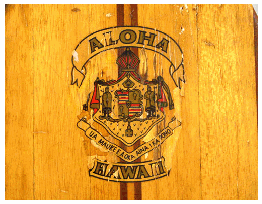 particular board features the "Aloha" state seal of Hawaii water-slide