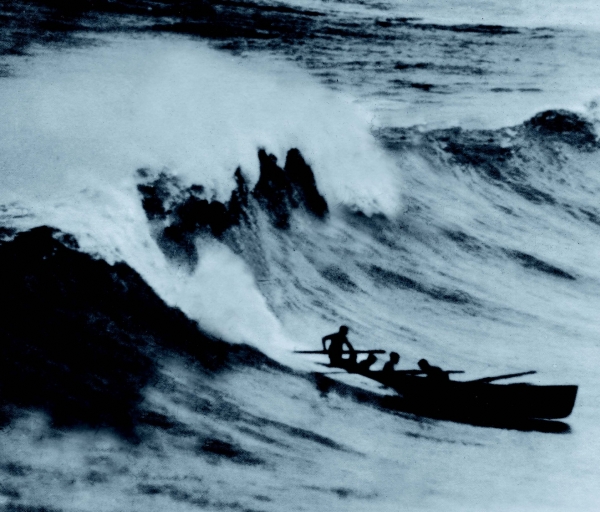and the wave broke and the boat broke, right down the middle. An oar