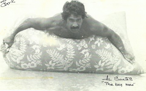 Al "The Bagman" Santos preparing a surfing bag and bagging a wave.