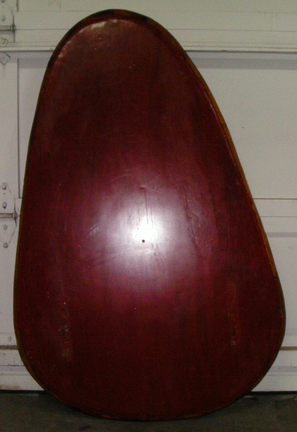 a resined, wooden, bullet shaped paipo ("The Bullet”) with a red and
