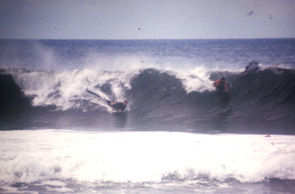 Ian (inside) at Pipeline in 1996, on a boogie board. Photo by Luke Peden.