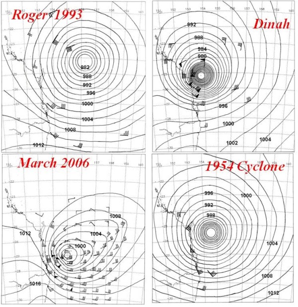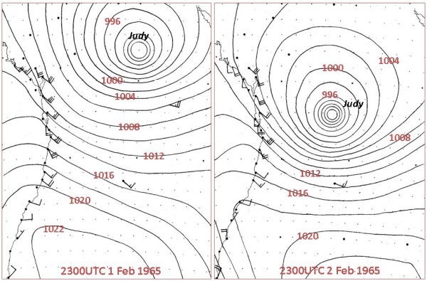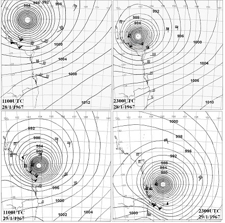 2. Had you seen belly-boarding before this? When and where was this? Not really -- only occasionally you would see the Hawaiian paipo boards in the U.S. surfing movies.3. Who made your first board? What was it like? I am pretty sure that Joey Larkin made them from marine ply under our specs. Later on we made them ourselves. We used to surf with Joe and were pretty friendly with him and I had purchased a couple of conventional surfboards off Joe in the past.4. Who were the guys you remember surfing these ply boards with and where were you surfing them? Terry Law, Col Taylor, Kit Carson, Graham Dunne, Graham Byrnes, Ken Wiles, Mick Potter, and Jimmy Purdon to name but a few. We surfed mostly at Kirra, Duranbah, Snapper and Bogangar. I guess in the pre-leg rope days we were the first to regularly take off behind the rocks at Snapper as it was relatively easy to do on a belly board. We were probably the first to regularly surf Duranbah, after it magically appeared, after the Tweed training walls were extended by 1963. We had other excursions like people do today further afield from the beach breaks at Surfers and Hastings to Angourie etc.5. When did you move to Torquay? Were guys riding bellyboards when you moved to Torquay? If so, what type of boards were these? I was a member of two Antarctic expeditions, in 1966 and 1970, spending a year there on both occasions. Before going down there we were training in Melbourne for six to nine months and that is when we surfed Bells and Winki. The first time I went down there it would have been July or August 1965, and I caught the train down to Geelong and hitchhiked down to Bells. I got a lift from a member of Torquay Surf Club and he drove me to Bells and it was 10 foot (face height) and perfect. I body-surfed it as I didn’t have a belly board there at the time. Kit got married and came down to Melbourne shortly after to work and brought down the belly boards. I think we mainly surfed Bells around that time. When I got back from the Antarctic we started surfing Winki. But I went back to the Gold Coast early in 1967. By the time I went back to Victoria in February 1969 (before the 1970 Antarctic trip). Kit was well established and brought a weekend house with Rocky Hall, at Jan Juc. We (Kit, Rocky and me) surfed (bellyboards) always at Winki till I left for the Ice in December and we had some incredible surf. We virtually had the place to ourselves every weekend as this was the pre-leg rope era and the cliffs at Winki were unforgiving on boards. A few of the Torquay crew started using bellyboards, particularly Ian Seely, John Olsen and Rocky Hall. Col Taylor began surfing belly boards as he was down in Melbourne at the time running an office cleaning business. Col previously was a well known conventional board rider progressing from Yallingup, Sydney to the Gold Coast. I had further stints in Melbourne in 1974, and 1982, of around 9 month durations in each case, while engaged in Bureau of Meteorological courses, and I continued belly boarding there from Winki, 13th Beach and the Portsea area, etc. 6. You’ve surfed two of the world’s great waves, Kirra and Winki, on ply bellyboards. Did your approach to riding these waves differ? Could you tube ride these ply boards? Both are obviously great waves and you could get tubed in both on the ply boards. Very large days at Winki were easier to surf than similar days at Kirra due to the lack of sweep and also the tendency to have longer lulls between the sets. Though one day (around Sept. 1971) I went out at Winki with no one out at Bells or Winki as it was maxed out. It was very difficult getting out with a strong side sweep, but I got out and got a wave which swallowed me up and I ended up near the steps past Boobs. I heard later that the waves were large even at the protected Fisherman's Beach where a wave ski snapped in half.7. Do you see any connection between bodysurfing and the technique used on bellyboards? We thought of it as body surfing with an aid and it opened the opportunities of what we could achieve while minimising the medium between us and the ocean.8. You’ve been described as pretty fearless in big surf. What was your attitude to riding big waves? We considered the ultimate was to ride the surf generated by tropical cyclones and east coast lows. This was a period (prior to 1977) which experienced a very large number of impacts from these events (see below). Maybe Tim Winton in his book Breath sums up the reasons for the attraction of surfing large waves. You sure feel elated after a big wave session.9. Of all the waves you’ve ridden are there any that still stand out for you? The New Year's Cyclone 1963, where we (with Peter McNiven) paddled out off Snapper on surf boards and by the time we got out we were at a very large break way outside Kirra. We got a wave each before we were engulfed. Today they would tow it. The Anzac Day Cyclone 1963. I was alone off the Big Reef at Kirra on a surfboard where a big left was pumping. This also produced the historically legendary surf at North Narrabeen. TC Judy 3 February 1965 Kirra Point (see below). All the 1967 cyclones and east coast lows were memorable and TC Dinah (category 4 cyclone off the Gold Coast and see below) stood out. We surfed Dinah (belly board) for days as it came in and when it was just off the Gold Coast we had a rescue when two lifesavers were swept around from the inner break at Greenmount to the shark buoys at North Kirra. It was an incredible experience swimming out to the shark buoys with Vic Arnell and Wren Bligh. Somehow or other John Cunningham also made it on a rescue buoy after several attempts. Tropical Cyclone Giselle came past Kirra in April 1968. This was the cyclone which sunk the Wahine in Wellington Harbour with the loss of many lives. I believe many people got safely off the Wahine but perished in the vicious shore break which was generated by the cyclone on the steep banks of Wellington Harbour. The w