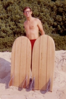 1965-era paipo boards, (left) a curvy "tanker board" with a large
