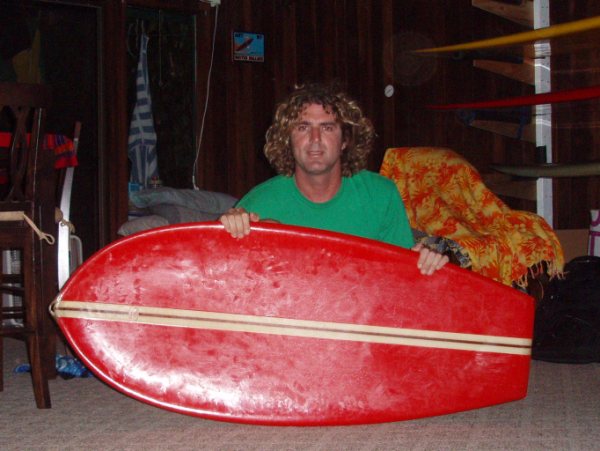6. How did the board ride? What sort of waves was it best suited to? The board was a real slug until you got the right day. In fast, hollow, section-less waves, like Honolua Bay, Shark Pit, Ma’alaea, or Lahaina Harbor the board rides like a dream. And when there were bodyboarders out I would get some funny looks and lots of questions.7. You described Vinny as a "genius" in your e-mail. Can you expand on this? As far as surfers go, we are a pretty close minded bunch in the design department. I think Vinny is a genius in that he was taking on radical new directions in shaping – and also the way in which boards are ridden. For example, he and Bunker Spreckles were involved in making boards that you could surf lying prone, kneeling, and standing. Often this was done all on the same wave depending on the needs of the rider. Vinny was looking beyond the status quo that labeled you as a surfer, knee-boarder, or belly-boarder. I think he was looking to for total stoke no matter what it looked like. Vinny was also shaping boards with air tunnels running through the deck and releasing out the bottom. The idea was to minimize wetted surface by funneling air to the bottom of the board, thus increasing speed. He is still shaping, and creating under his house which is a feat in itself. Vinny is a tall man, maybe 6’5”, and the shaping room under the house is only about 6’ tall. Yet, he is shaping great boards.8. What was it like contacting Vinny about the board and returning it to him? I made arrangements to fly to Kauai a few days before leaving for Australia. I flew from Maui into Lihue and thumbed it up to Hanalei Bay and onto Waihiha with the board and a day pack. I must have had about 8 rides from a variety of people, and 6 of those eight knew Vinny. They all wanted to know what the deal was with the odd looking board under wraps. The typical response to me saying I was going to see Vinny Bryan was, “Ahhhh Veeeny (with a smile). You tell ‘em Kaipo say hello.” Meeting him was like hanging out with my own father. Very relaxed, casual, and welcoming. He made me feel like part of his family. He gave me the grand tour in his beat pickup, and cooked up a mean breakfast after sleeping on his couch overnight. I wanted to stay longer, but I had to go, so he drove me all the way to the airport.9. How long have you been making your own paipo? How do your boards differ from Vinny's? I made my first paipo right when I got to Australia. Since no one makes very wide blanks, I pieced one together from broken surfboards I found in peoples' yards during the council pickup. I found that, given the hollow beach-break conditions we often encounter here, I needed something for the days when surfing is not the best option. Being an avid bodysurfer, I am often frustrated by not getting very far in the tube... so I shaped a board modeled after a Hawaiian Paipo Designs board I saw a while ago. Compared with Vinny’s board, mine is straighter and flatter on the bottom. The outline is way different. The wide point is a few inches up from the tail. The rails go from soft in the nose and body, to very sharp in the tail. Like Vinny’s board, mine is only 1½ “ inches thick. Also, my board is finless.10. What are your thoughts on finless versus finned paipo boards? Depends on the conditions you are riding. I like the finless board for its side slipping potential, but in really juicy surf, fins can really help hold a high line. I find that the finless board requires far more work from the rider. Lots more weight shifting is required to ride critical faces and sections.11. In your travels do you see many paipo boards being ridden? Only a few places on Maui, and the name of the guy escapes me, but he is a local guy who just rips Honolua Bay when it gets big. Other than that, no.12. For you, what is the attraction of paipo boards? I love it as a surfing option. When most people won’t go out because it’s too fast or too small, I can have a lot of fun on a paipo. Also, it’s easier to carry around than my 10’3” longboard.13. Any waves or surfs stand out that you have ridden? Riding Vinny's board on Maui over the years, I have had the opportunity to selectively surf waves suited for it. When the crowds are thin, I have had good surfs, at Ma’alaea, Mala Wharf, Lahaina Harbour, Shark Pit, Rainbows, Ka’anapali Point, Flemings, The Bay, and Windmills. I would say Windmills is a stand out in that it is like a mini-version of Pipeline, without the hassles. Justin's quiver before leaving for Australia ![]() |