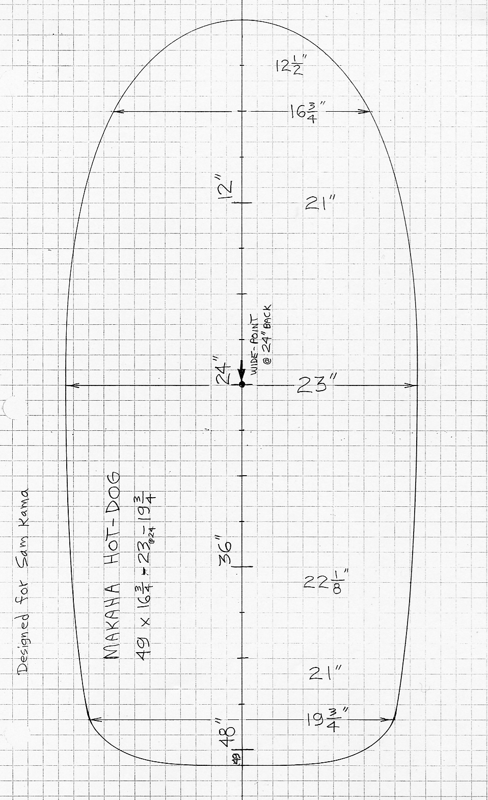 24 BDS. Designed for average height (5' 8") husky local guys and Makaha Inside Rights. Wide tail for speed.
