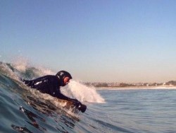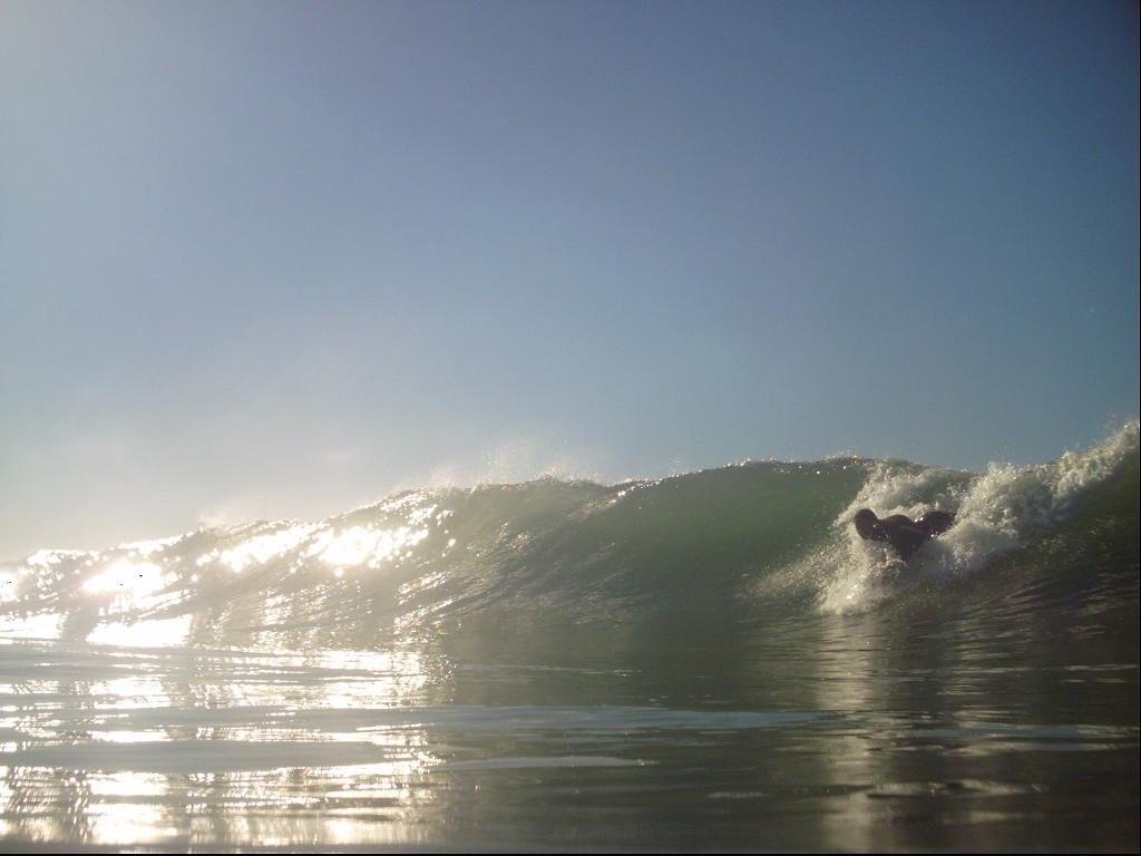 Mr. Mike at his local break catching some waves with his favorite paipo.