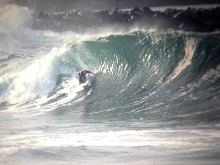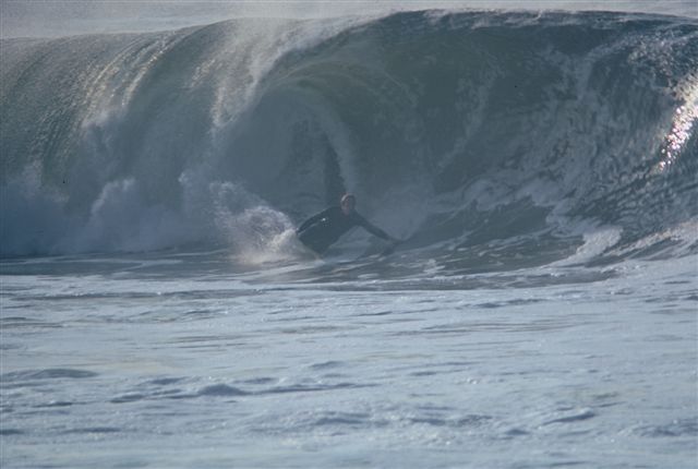 Wedge, May 24, 1999. Ron riding on a rounded pin tail quad (my favorite design and of those who ride my boards). The board