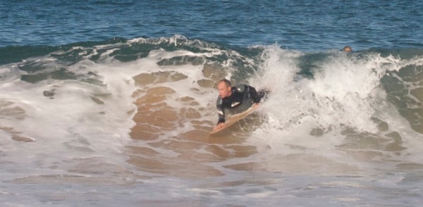 big to properly ride a finned surfboard. So he paddled out at stupidly,
