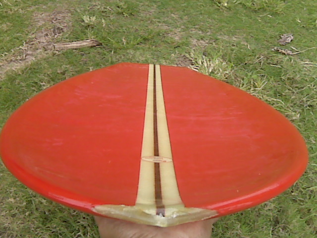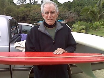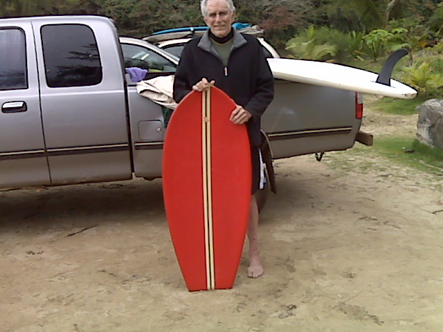 San Luis Obispo -- the Morro Bay area.6. What sort of waves were these boards made for? Was it a kneeboard or to be ridden prone? Hollow waves. Good waves. You could ride them either way.7. How many do you reckon that you made? Over the years a dozen. But that’s over the years. When I was a kid we made all sorts of stuff.8. Were they the ply paipos? We made plywood ones. In the late 1950s we probably made a couple of foam ones. I can remember a couple. We always made our own boards, most of the time anyway.9. Do you see much difference in the design principles for bellyboards and stand-up boards? They’re just stretched out. That’s all there is to it. Stretching it out.10. I heard you won a contest on a 4’6” board in 1970, at Honalua Bay. No, it was 5’10".11. How short did you get down to? As short as 5’5”. But that was someone else’s board. That was getting too small. We tried t keep it as close to eyeball height. We were riding really small boards then.12. What influenced you then – there were guys riding stand-up paipo back then? Oh, I don’t know. This was the late 1960s. We just started making smaller boards so we could ride places no one else would ride. That’s pretty much how it happened. Then they got crowded. There were no cords, no nothing, so we were able to ride waves nobody else wanted to ride. Hollower waves that the bigger, longer boards didn’t work in. A couple of guys were riding knee boards that could go fast enough.13. Did you experiment much with bellyboard design? Not too much. Not really much.14. I gather you experimented with stand-up boards. What was the most radical board that you made? Oh yeah. There were lots of kinds of strange ones that people would think were weird. Some were weirder than others. Some ideas worked better than others, too. But I don’t know what would be the most ridiculous. There was some pretty ridiculous stuff. Hours and hours of work for five minutes of finding out that you were totally wrong. That’s not an unusual occurrence. I have done some boards that were designed to reduce wetted surface area drag. They are very fast but hard to make.15. Did you ride bellyboards much when you got older? No, not too much. Just stand-up.16. When attracted you to bellyboards when you were younger? The Makaha shorebreak. It was a lot of fun. You could have a lot of fun with it. They’re really easy to play with. In those days you could make them out of anything. We made a lot of ply ones. It’s a good water toy for kids. God they’re wonderful, that’s why the boogie board is so popular.17. Some guys rode them in serious waves, like Sean Ross at Pipeline and John Galera at Jockos. Oh yeah. I'vr seen that. I love it.18. I’ve read on the SurferMag Forum about the board that was returned to you, 44 or 45 years later? Yeah, that’s right.19. What’s the story behind that? I made it for a friend of mine in college when I had a surfboard shop and was going to school. He had it, then he gave it to his son. His son moved to Maui and he found out I was still here. Then he moved to Australia – somewhere in Queensland right now. He’s quite a water guy.20. What was his name? Justin Bullock. He’s quite a character. He’s done some movie work. Give him my love if you see him. His father and I were close friends in college and we surfed together. I made him that board. Justin had the board on Maui and brought it over and gave it to me. He was giving all his boards away. He couldn’t afford to send them to Australia. He had a bunch of happy Hawaiians in his backyard for a while. He had a pile of really nice boards. He got in touch with me and gave it back. It looked almost as good as the day as it was made. It was beautiful.21. What was it like getting that board back after all those years? It blew my mind. Amazing. I did some pretty good work back then. It is all 10 oz. cloth man and you don’t see that much anymore. The resin was hard as a rock. They took good care of it. I was absolutely amazed.22. Have you used it? No. I have a grandson who might use it.23. Was it made to be ridden on you knees or prone? Either way. If you were to ride it on your knees you had to get into a really teeny ball. It’s really short and it was kinda cool. I rode it 4 or 5 times. But it was in California and the water was cold. Who likes that?24. What was cool about it? What did you enjoy about the board? It was fun, it’s just a fun board. It was fast, pretty fast. A square tail. I’d make it a little different now. That was a long time ago.25. How would you make it different now? I’d make the rails sharper, still like that. If the rails were sharper you’d get more release, that would be nice, a bit more punch out of it. The rails were a little too rounded for me. I like them squarer thank you. Not square, but I want the water to go away.26. Do you have any other comments? If you surf don’t stop. That was a Miki Dora or somebody like that. Go surfing every chance that you can. Enjoy it. When you can’t you’ll be bummed. Appreciate it. Please, and be nice, that’s always good.
