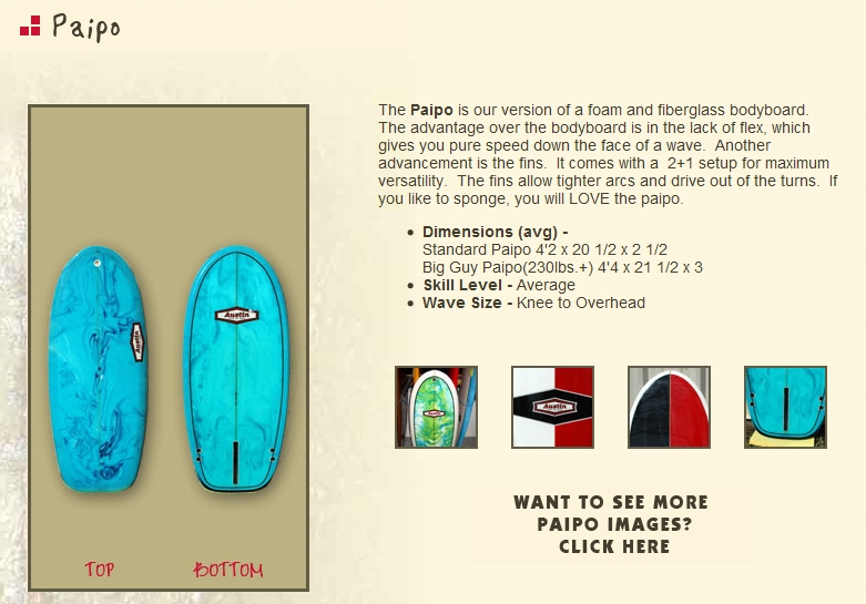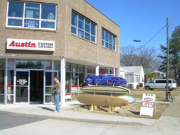 ![]() 513 19th Street, Suite 101 - Virginia Beach, VA 23451 (Note: New name, new phone, new e-mail - see below) Located a block or two past WRV Surf Shop New Frontiers in the Austin Paipo Line of Boards: The Balsa Paipo ![]() This is a balsa paipo with paulownia stringers, noseblocks and tailblock. The fins are made from paulownia and african mahagony. See larger versions of these pictures on Facebook and in the Paipo Forums. Additions to the Outstanding Austin Paipos Being Built in the Good Ol' USA ![]() New Surf Shop Name, Same Location ![]() ca. February 21, 2010 513 19th Street, Suite 101 - Virginia Beach, VA 23451 (757) 428-SURF | e-mail Located a block or two past WRV Surf Shop |