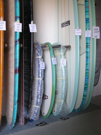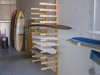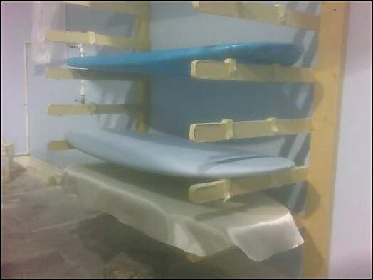 racks. I must have counted about a dozen boards ready to be glassed, in