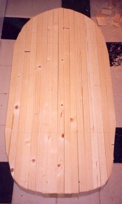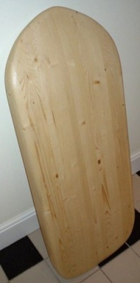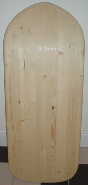 He used the board twice during 2003. After each session he modified the board to remove some of its 'boxiness.' He still plans to make additional modifications to the board: increasing the nose and tail rocker and making the rails less 'square.' The board weighs about 10 kilos out of the water, "but is exceptionally buoyant and maneuverable, easily outperforming modern bodyboards." Chris asks, "Does anyone know of another board that has been built with this design? |