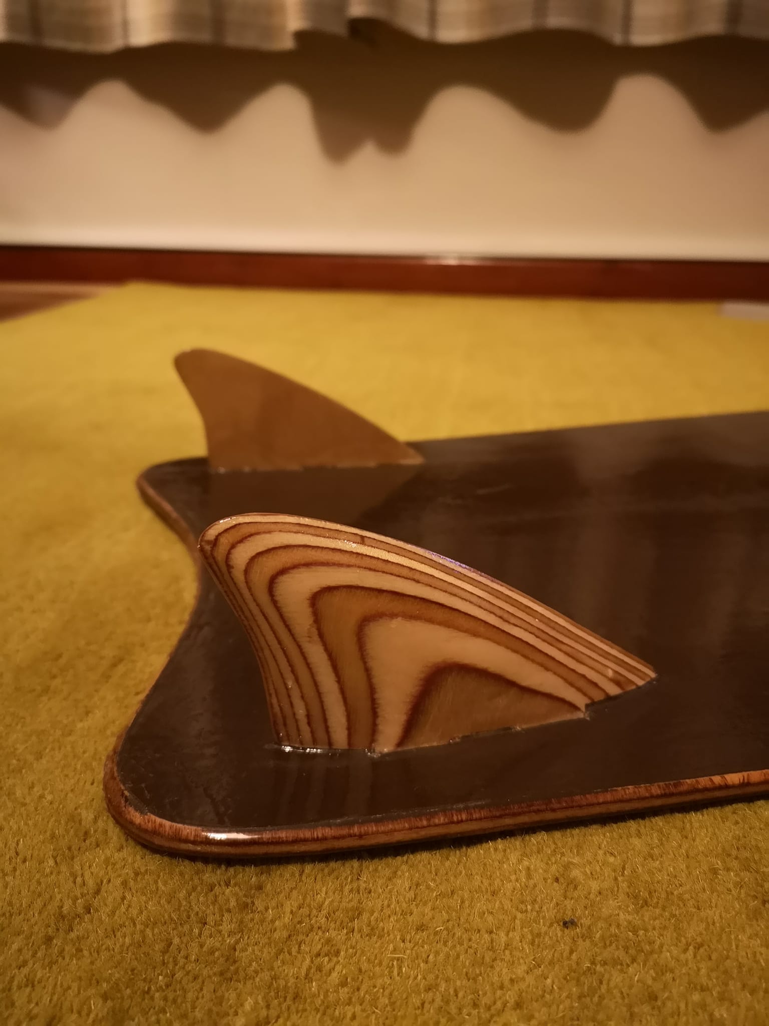 Board 2 is a twin fin. I have rode this board to death. This board has been the best fun. It's fast as a whippet and turns like scalelectric car. I pushed this board to it's limits and I'm actually dissaponted I haven't snapped it. That would be like the perfect end if it broke riding a monster wave. My friends advised about fin shapes and styles. I learnt from this to make the fin the right size for the board. Foil it so it works as a fin and not just for show. The inner face is flat, the outer face shaped like a boat sail, I used to sail so that how I describe it. Water then flows faster around the outer and generates speed. They have a very slight toe in as too much would create drag in the waves I ride. This board is a gem a real triumph, luv it but people asked if it needed fins? Hhmmm I thought, there is only one way to answer that.
