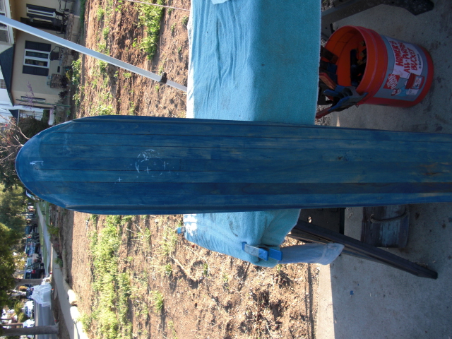 This is a board I made out of some base board molding someone gave me it was 10' long and 3/4" thick. 10ea of them made of ash I think. I strip the edges off and ending up with 1 1/8" wide strips glued them togather to make a plank 12" wide and 5 feet long and 3/4" thick. when it was finished it is 12" at the nose and 10" at the tail and 1/2" thick. stained it blue. rode it on monday it is a cruseing plank