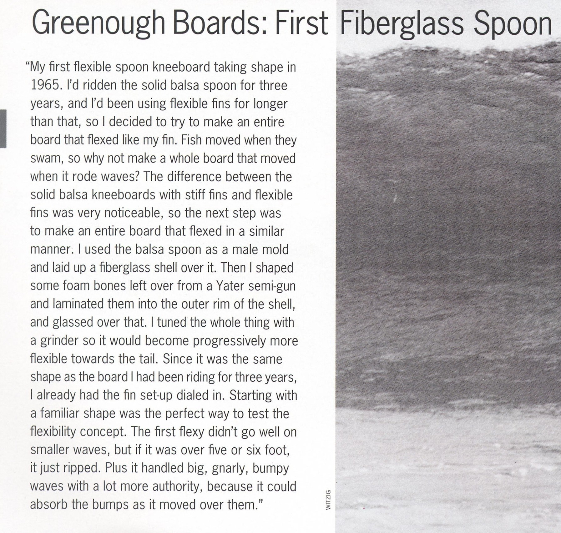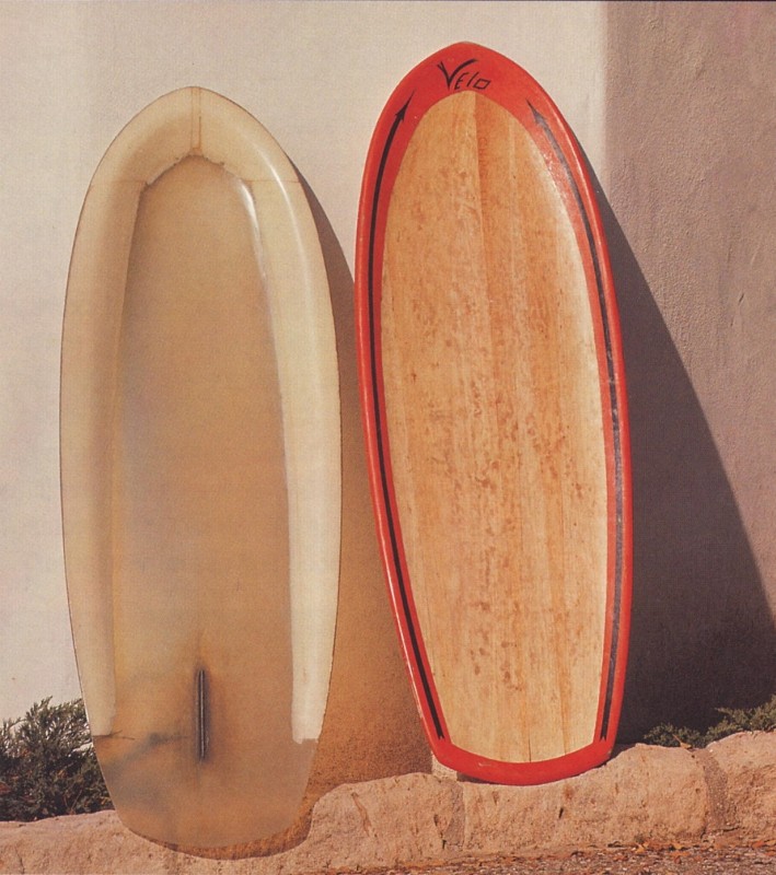 Coincident with Wegener's post, check out The Surfer's Journal, vol 07 no 04, pp84-87, where Greenough moves away from wood and twin fins to fiberglass/foam and a single fin, and eventually to the infamous Velo. Greenough also mentions how he started out with a twin fin, kept placing the fins closer and closer together and that eventually they merged into one flexible fin.