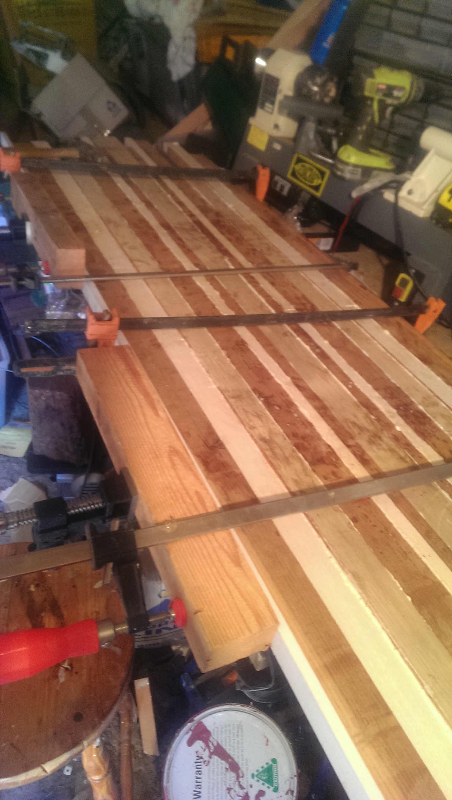 Finally got it all glued up - pic below. Looks a bit messy at present! I used urethane so it expanded as I don't have a jointer/planer or thicknesser, so had to rely on my accuracy with the old tablesaw. The glue will fill any small gaps.