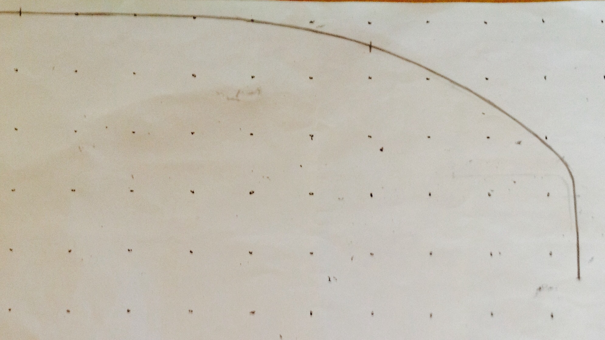 Here's the right half of the shape. I'm keeping the middle 14 " of the deck flat (red dots) and then rolling the sides down.
