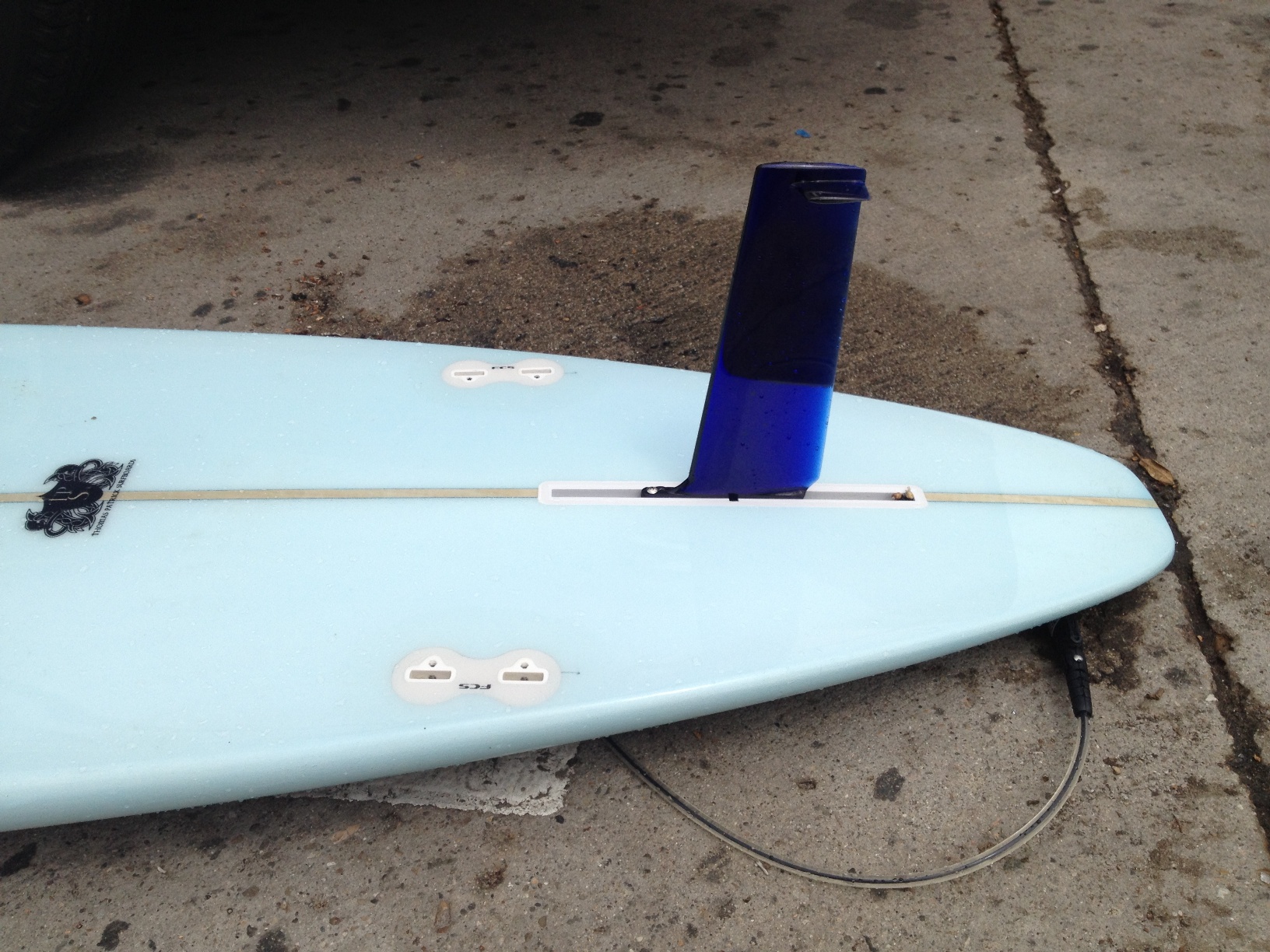 The science is pretty interesting, and while I think some of it is applicable to surfcraft, my personal experience with the WaveGrinder was disappointing. This fin is pretty fast when paddling, and/or riding in a straight line. But not really noticeably (to me) faster than some of the fins I use. I found turning to be the problem. It made the board difficult to roll onto its rail. Instead, the board wanted to pivot around the fin in a horizontal plane. I set the fin in a board I was very familiar with as both a 2+1 and as a single-fin. Followed the direction for placement, and made a few adjustments. Bottom line, I didn't like the feel while turning, and didn't find the fin significantly faster than my favorites. Pix below are of the WaveGrinder in my (then) trusty 9-6 modern LB, my favorite 2+1 set-up (Yater Pivot) in the same board, and my favorite single-fin (Velzy Noserider). Both of the center-fins are (relatively) high-aspect, low rake designs, which I'm in complete agreement vis-a-vis drag reduction. I spoke with the WaveGrinder's designer, and he indicated that they had developed prototype side-bite fins (same design, but smaller 5"). He offered to send me a set, indicated that they are symmetrically foiled, and would therefore have to be set with no toe-in. I declined the offer, not having the resources to shape a board just to test fins which I already didn't have much faith in.