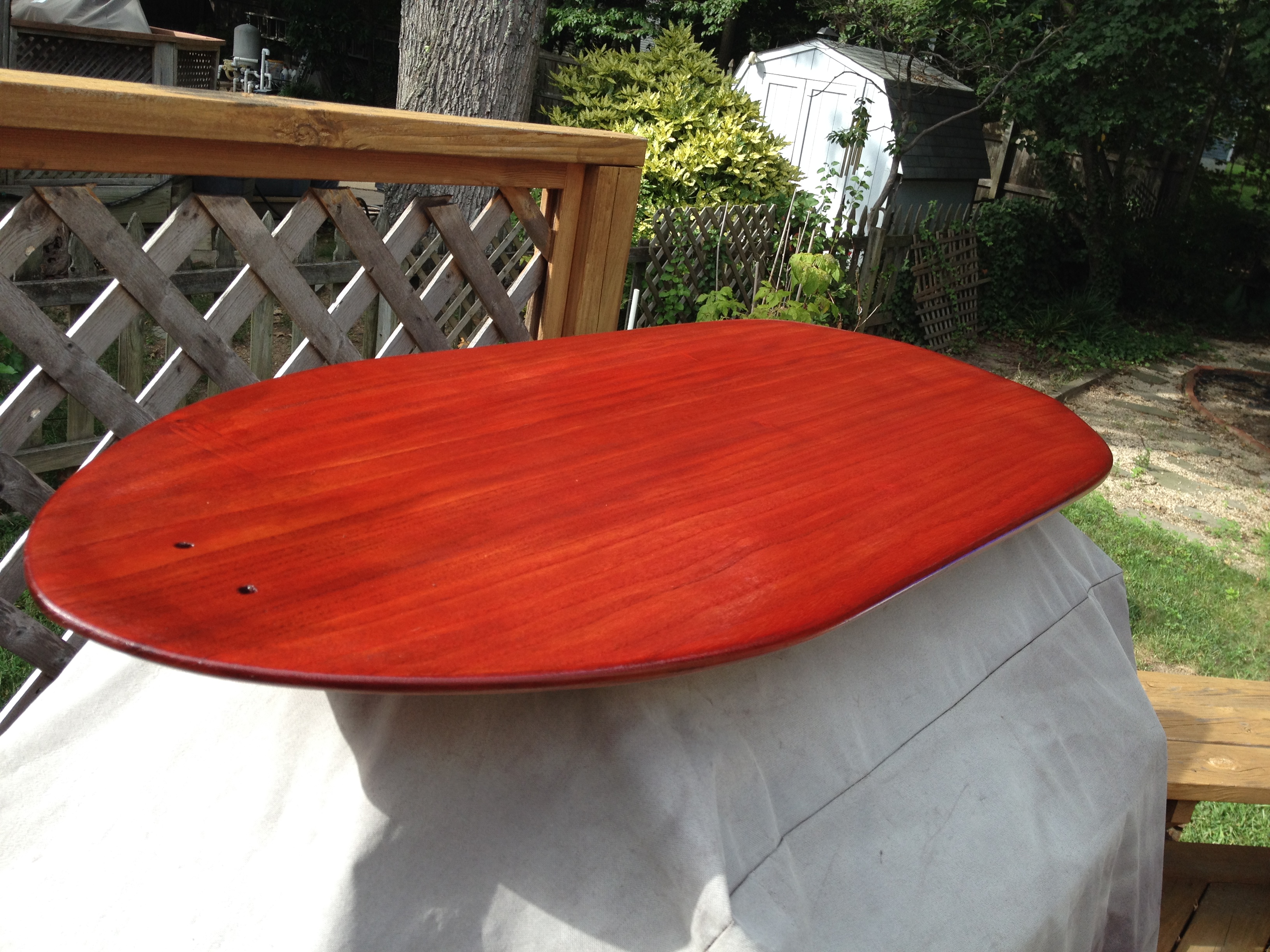 Here are some pics of 2 boards I made last summer. Paulonia boards joined with pieces of carbon, dyed with wood dye and finished with spar varnish. Fast and Fun. Holes in the nose are for the leash cord.