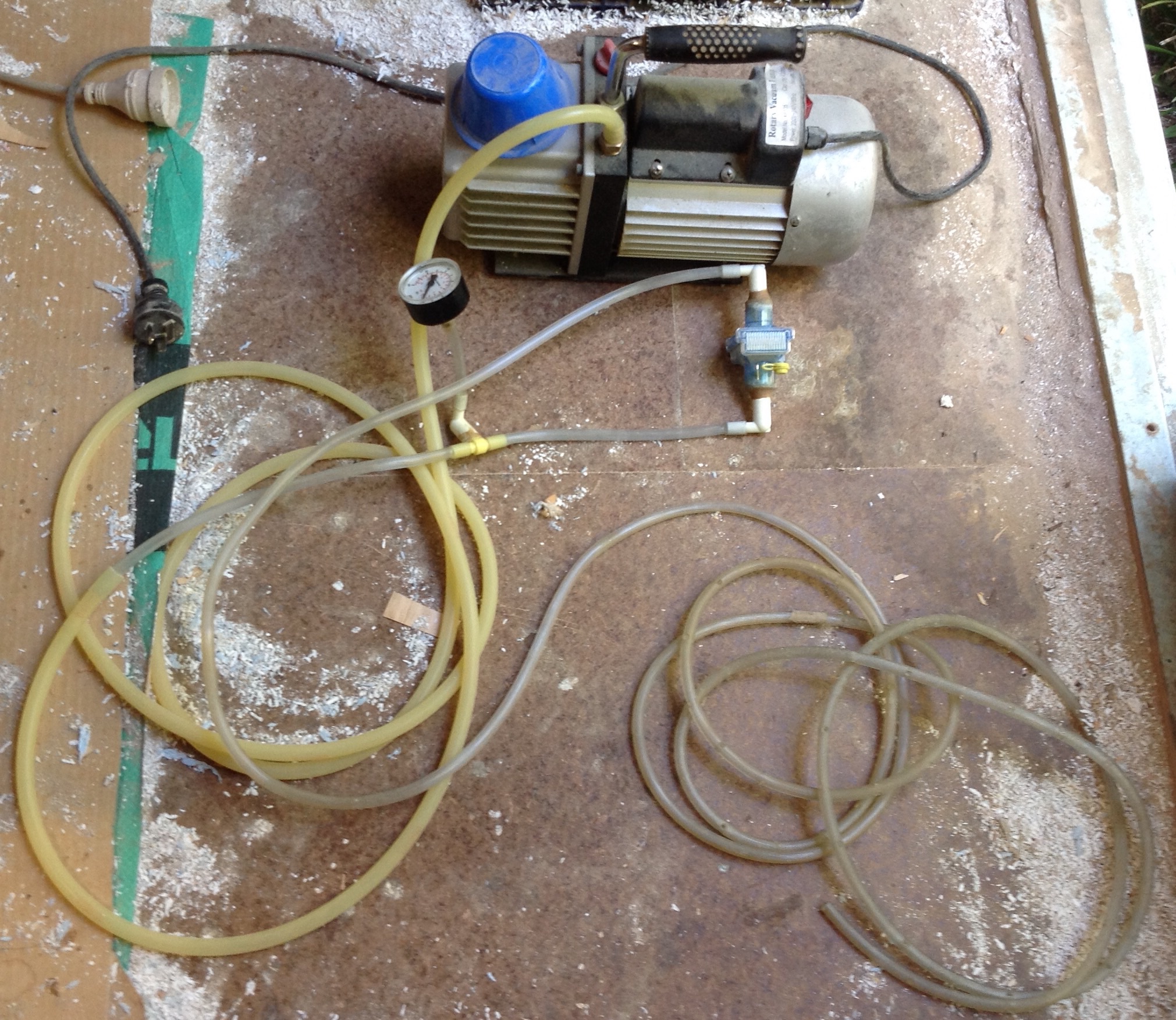 The pump sucks the air out of the bag but it also sucks the plastic and the glass on to the ply and draws away excess resin so you end up with a glass job that sticks exactly to the shape and doesn't carry excess resin that makes it heavier than it needs to be. You only throw away a plastic bag and a bit of sticky tape and there's no resin to clean up or scrape off the floor like standard laminations.
