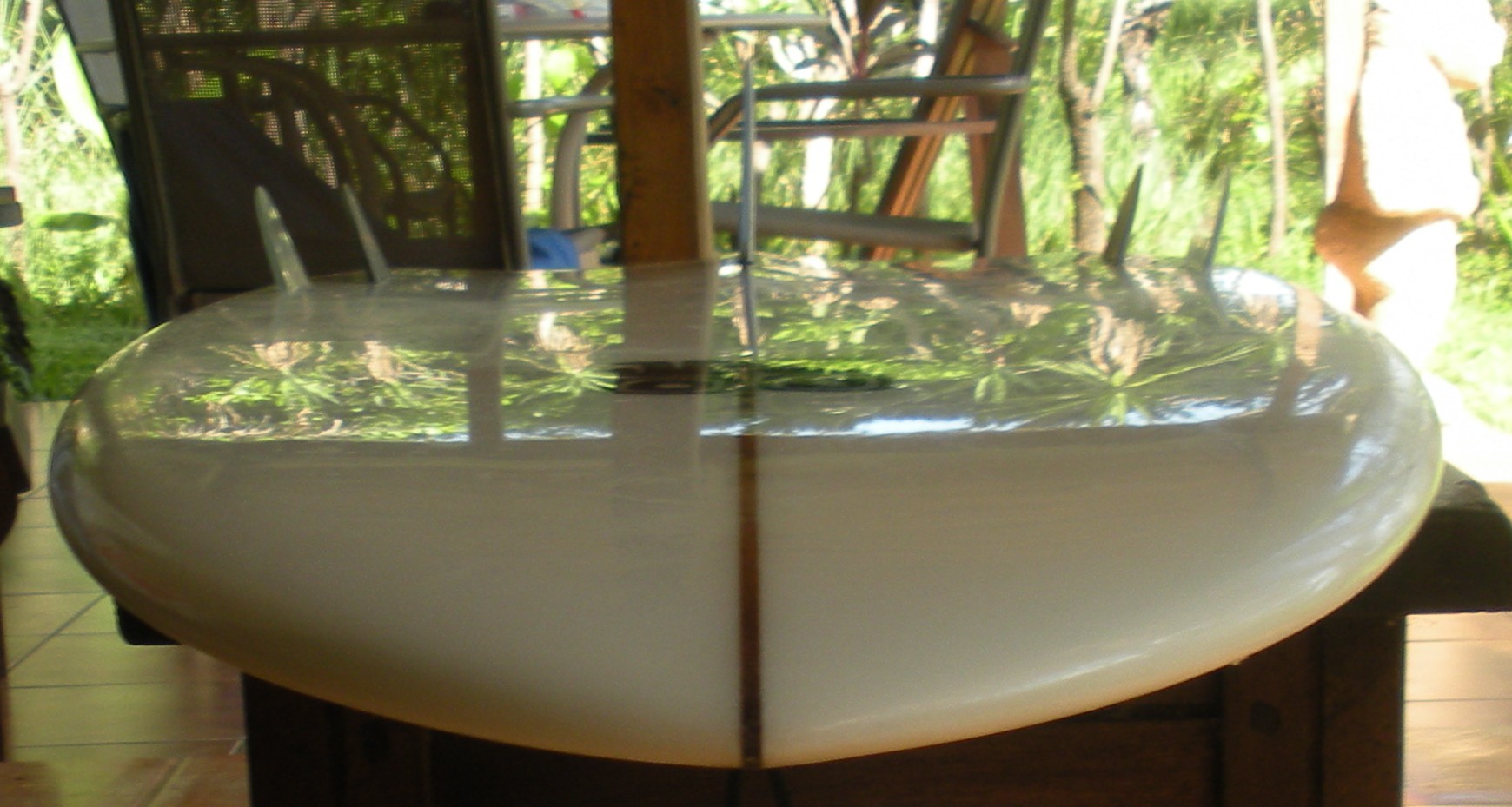 The first five days of riding the Bonzer board really consisted of a series of sea trials revolving around the fin arrangement. The baseline fin configuration consisted of the 5-fin set shown in the above photographs. The center fin is a True Ames Bonzer 6-inch fin. A Bonzer fanatic friend living in Okinawa was certain I would need a 7-inch Bonzer fin and sent it along with my surfing friend, Terry "Moses" Newcomb. I had my doubts! Over the first five days of sea trials surfing I steadily reduced the total surface area of the fins.