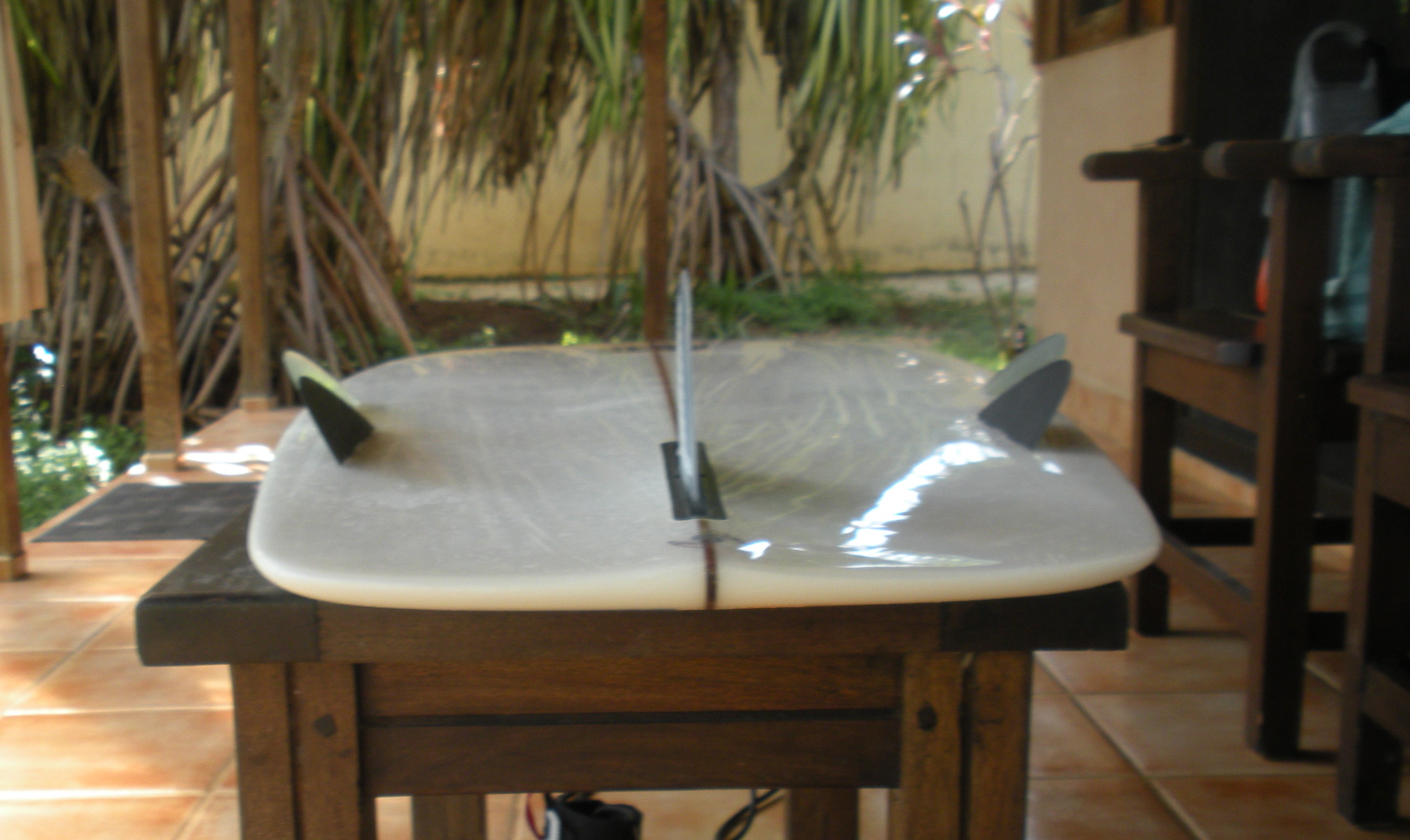 The 6-inch fin was simply too stiff to easily turn. Plenty of straight ahead speed and hold but the turning capability was nil, at least for my style of riding (the center fin was situated in the correct "bonzer profile) unlike in the above pics. Moving towards a 5.25-inch bonzer fin (formerly a 6" True Ames chewed up reefs and fixed up) improved the situation but still not there. The next day I moved to one of my standby fins, a 4.5 inch FCS-5 blue honeycomb. Getting closer, but still didn't have the ability to turn-on-demand and pivot quickly. Need that to dodge the concessional lava rock, ya know?
