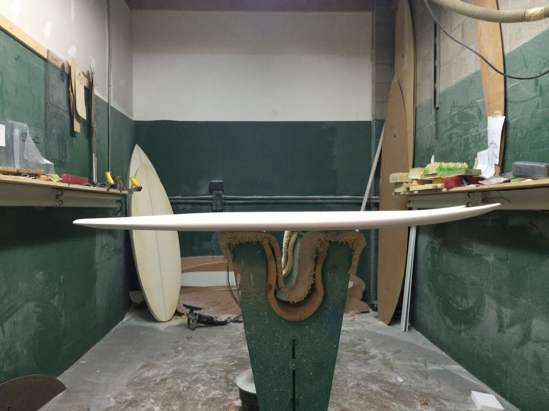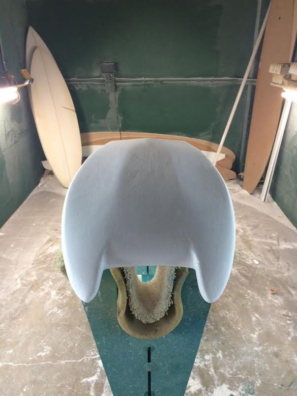 Got it pretty much scrubbed and the fork nose rough-shaped. Sitill needs some finishing, but here's a peek...note V in tail, slight concaves in outboard panels and flat middle panel. Deck concave is deeper than the G4, rocker flatter in tail to avoid speed max-out, and thickness has been shifted forward. Comes in at about 25.5L. Happy Thanksgiving to all!